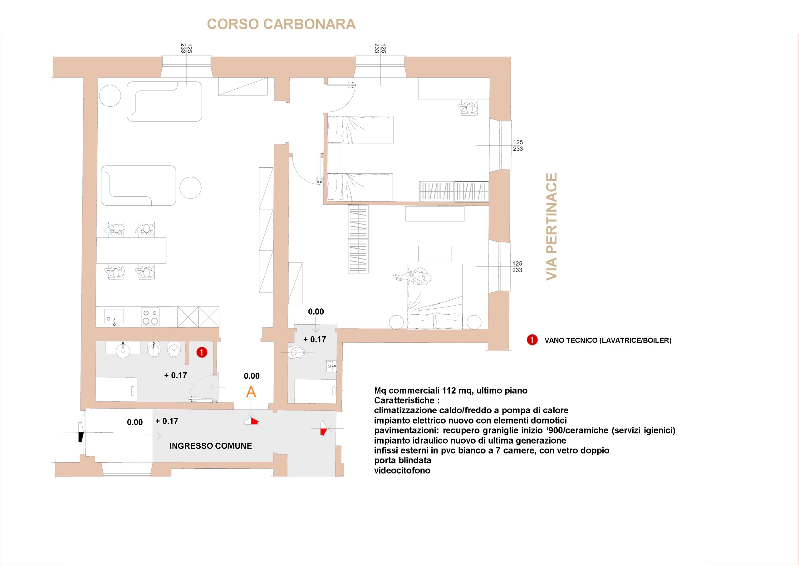 La prima unità di mq 112 è composta da; ingresso, un ampio vano open space con angolo cottura, due camere da letto e due servizi.