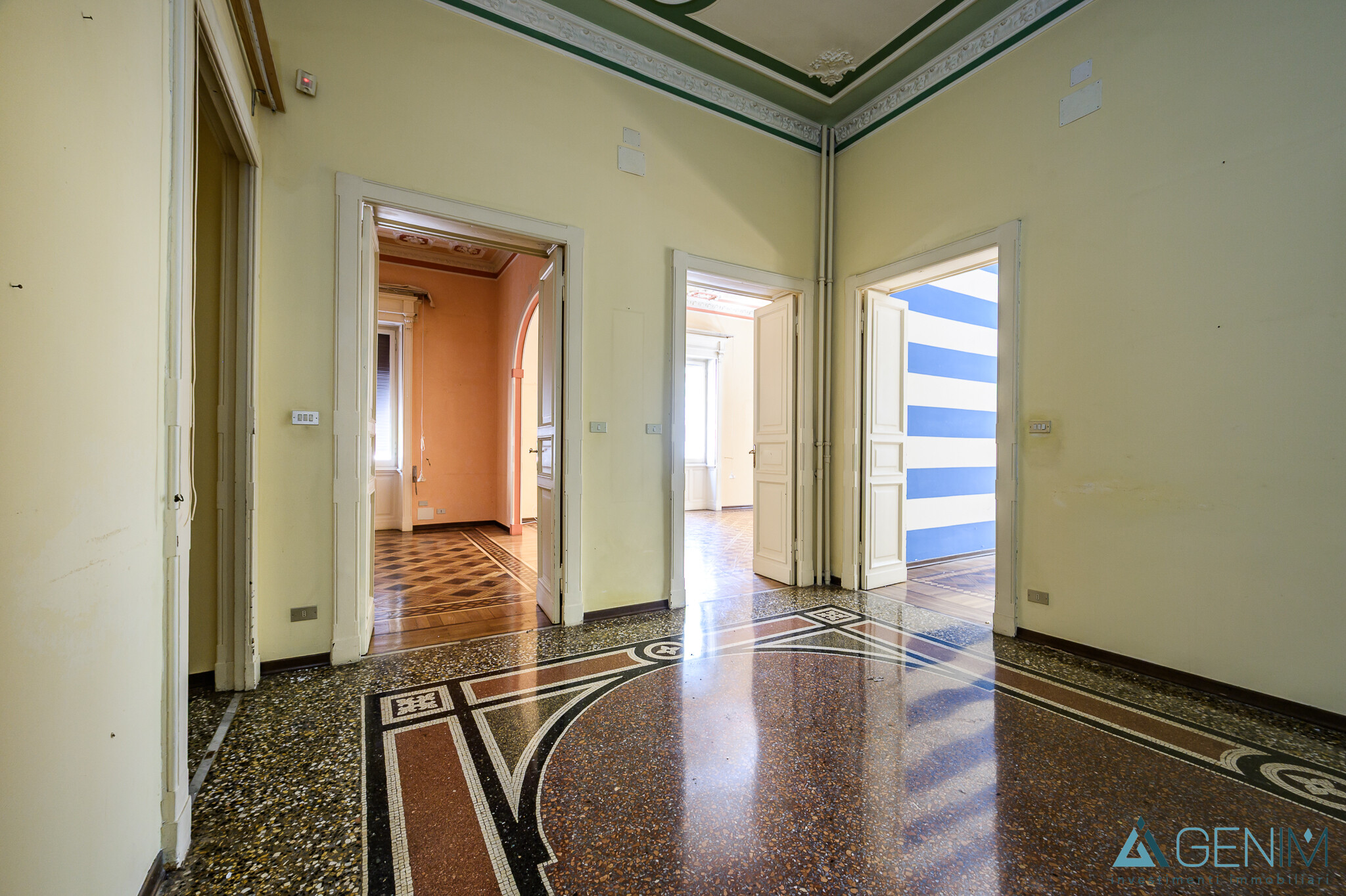 Gli ambienti sono rifiniti con materiali di pregio, è stato eseguito un restauro conservativo che prevede la conservazione e il recupero del parquet originale d’epoca, sono stati restaurati i soffitti decorati, con stucchi e cornici che donano eleganza e raffinatezza agli ambienti. Infissi in PVC doppio vetro, porta blindata e tapparelle elettriche.