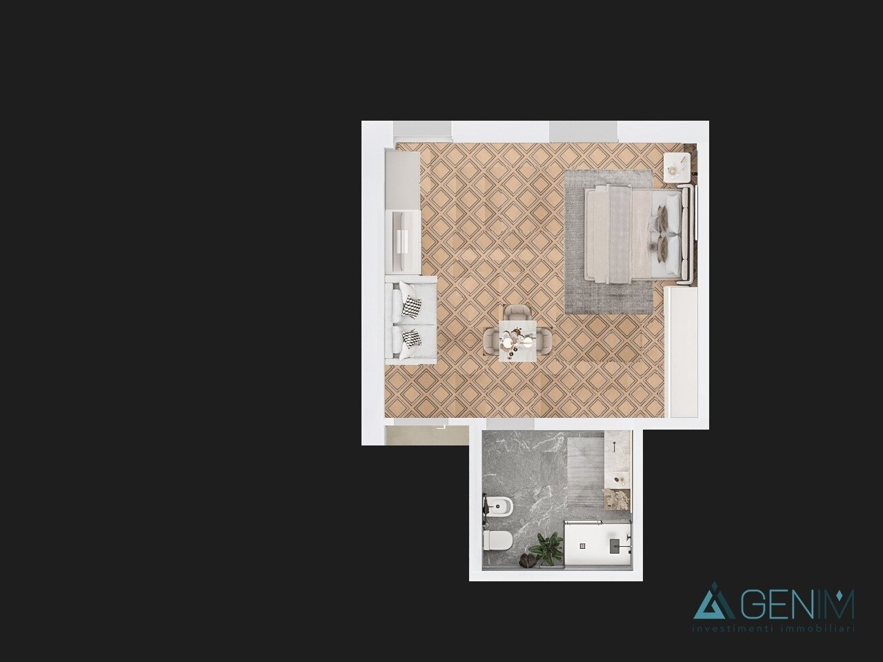 L’appartamento è composto da un ingresso su ampio open-space vano unico con cucina a vista, e un bagno completo.